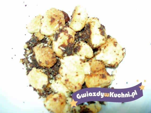 Przesianą na stolnicę mąkę posiekaj z masłem, dodaj żółtko, cukier, zagnieć, cienko rozwałkuj, pokrój na paseczki, upiecz w średnio nagrzanym piekarniku na złoty kolor. Sparz mak, odcedź na gęstym sicie, dwukrotnie zmiel, utrzyj z cukrem i z miodem, dodaj sparzone, obrane ze skórki i zmielone migdały, namoczone rodzynki i pokrajane figi. Ubij śmietanę. Masę makową wyłóż do salaterki, ubierz krem, obłóż łamańcami.
