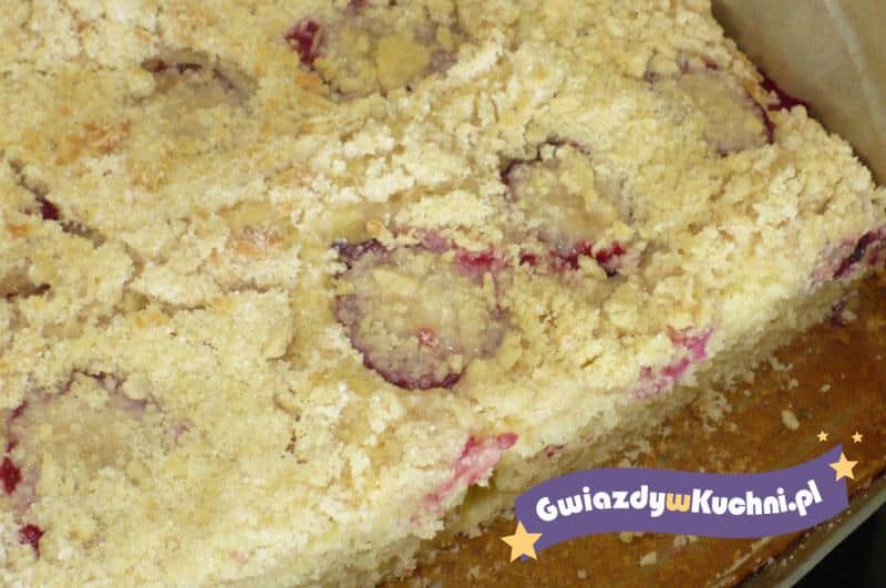 Jajka ubić z cukrem, ubijając dolewać olej. Następnie dodawać mąkę zmieszaną z proszkiem na przemian z śmietaną. Ciasto wyłożyć na wysmarowaną blaszkę a na wierzch ułożyć owoce. Zrobić kruszonkę z masła, mąki, kokosów i cukru.