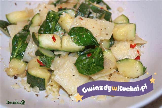 Łazanki ugotować w osolonej wodzie (takie al dente). Odcedzić. Na rozgrzaną oliwę z oliwek wrzucić pokrojoną w kostkę cukinię, gdy się delikatnie zeszkli, dodać liście szpinaku, posiekany czosnek, drobno pokrojoną papryczkę chilii, oprószyć wszystko solą i świeżo zmielonym pieprzem. Dorzucić makaron i wymieszać.