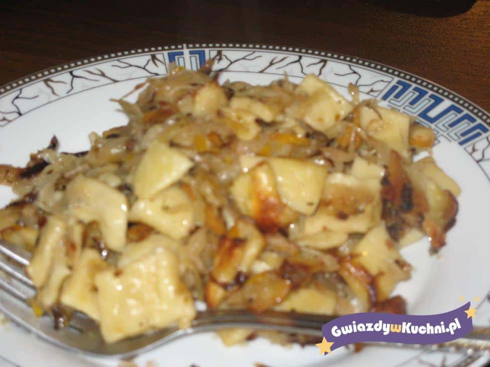 Ugotować makaron na łazanki. Kapustę drobno pokroić, sparzyć i dobrze odcisnąć. Cebulę pokroić w kostkę i podsmażyć. Grzyby namoczyć, odcedzić i przekręcić przez maszynkę, połączyć z cebulą i z kapustą. Podlać odrobina wody i smażyć na małym ogniu mieszając. Przyprawić solą i pieprzem. Gdy kapusta będzie miękka dodać makaron i wymieszać. Podsmażyć chwilę wszystko razem.