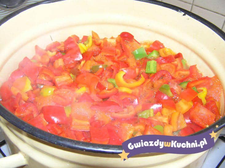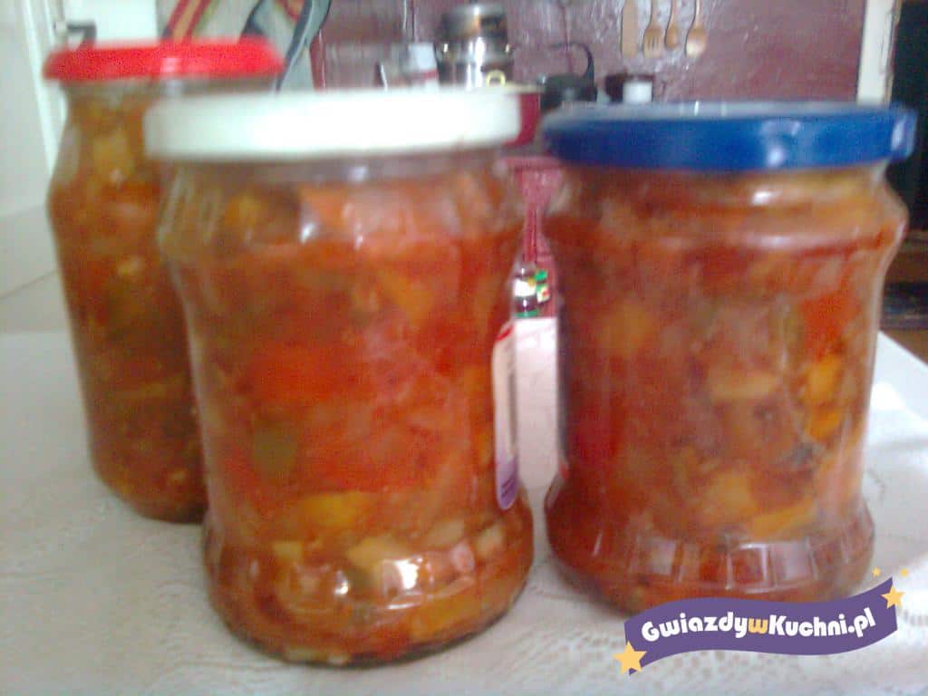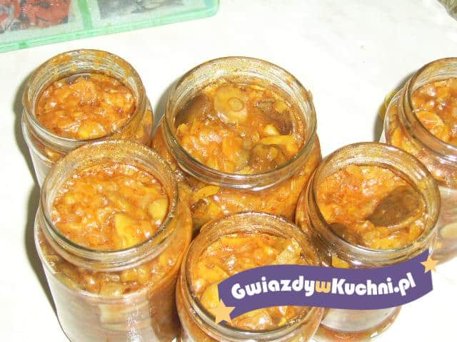 Cebulę usmażyć na oleju. Cukier, sól, paprykę, ocet i koncentrat pomidorowy zagotować. Dodać ugotowane, pokrojone grzyby i wszystko wymieszać. Nakładać w słoiki i pasteryzować 15 minut.