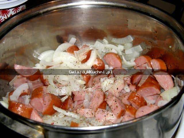 1. Cebulę pokrojoną w talarki smażymy razem z kiełbasą pokrojoną w plastry i boczkiem w baski na oleju.
