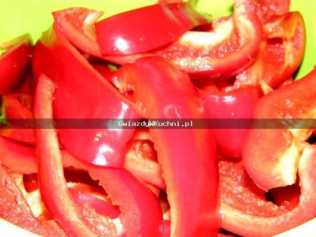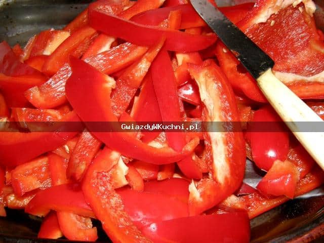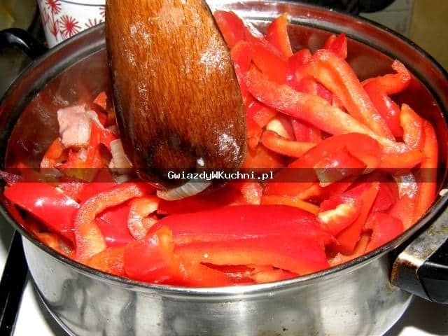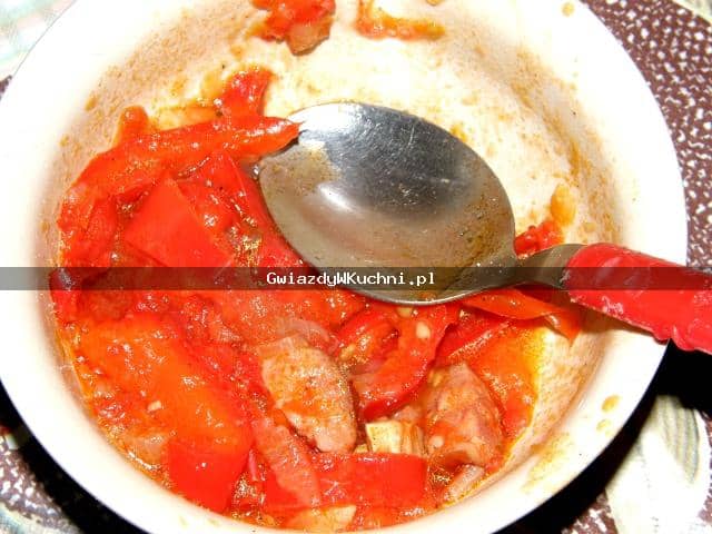 2. Dodajemy paprykę, pomidory bez skórki pokrojone w plastry, zalewamy 100 ml wody, dusimy pod przykryciem około 40 min. Pod koniec dodajemy mały przecier pomidorowy i mieszamy.