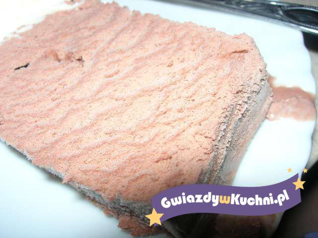 Schłodzoną śmietanę przed wylaniem zamieszać, połowę wylać do głębokiej miseczki i dokładnie wymieszać z 1 łyżką cukru pudru i cukrem waniliowym.