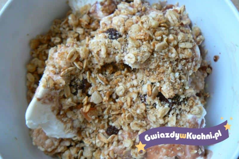 Lody nałożyć do miseczek lub pucharków, odczekać ok 5 min, by nie były takie twarde. Polać polewą czekoladową. Posypać obficie musli.
