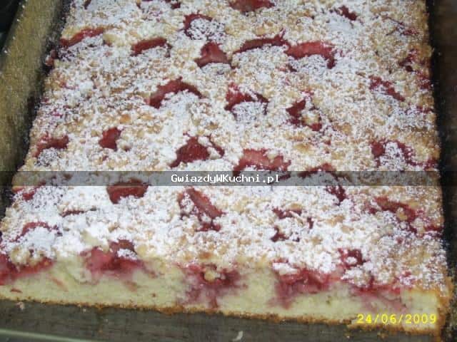 Truskawki myjemy, osączmy i kroimy w plasterki. Ułożyć na cieście. Piec przez kwadrans w piekarniku o temperaturze 220 stopni.
