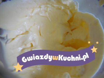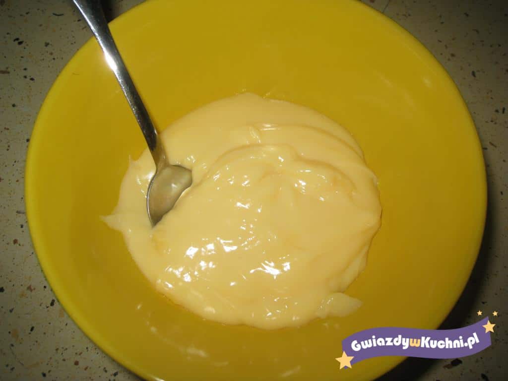 Wszystkie składniki powinny mieć temperaturę pokojową. Zmiksować żółtka z musztardą i sokiem z cytryny. Cały czas miksując powoli dolewamy olej, począwszy od kilku kropli. Z chwilą gdy majonez zacznie gęstnieć, dolać pozostały olej, niewielką strużką. Doprawić do smaku solą i pieprzem. Można też dodać szczyptę cukru.