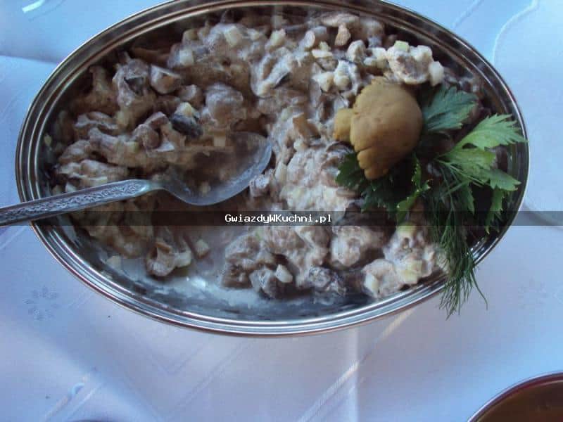 Grzybki kładziemy na sitko do ścieknięcia. Następnie kroimy drobno w kostkę. Doprawiamy solą i pieprzem. Na koniec dodjemy majonez.