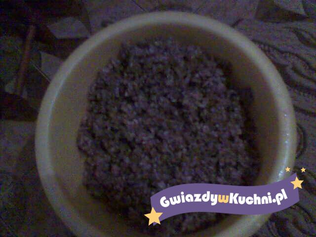 Mak zalać wodą lub mlekiem i podgrzewać na małym ogniu aż woda odparuje. Przekręcić przez maszynkę trzy krotnie. Margarynę utrzeć z cukrem i żółtkami. Dodawać stopniowo mak, miód i bułkę tarta. Dodać olejek i bakalie. Na końcu dodać ubitą piane z białek i delikatnie wymieszać.