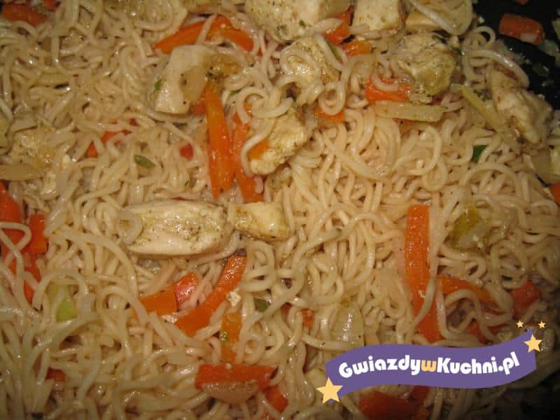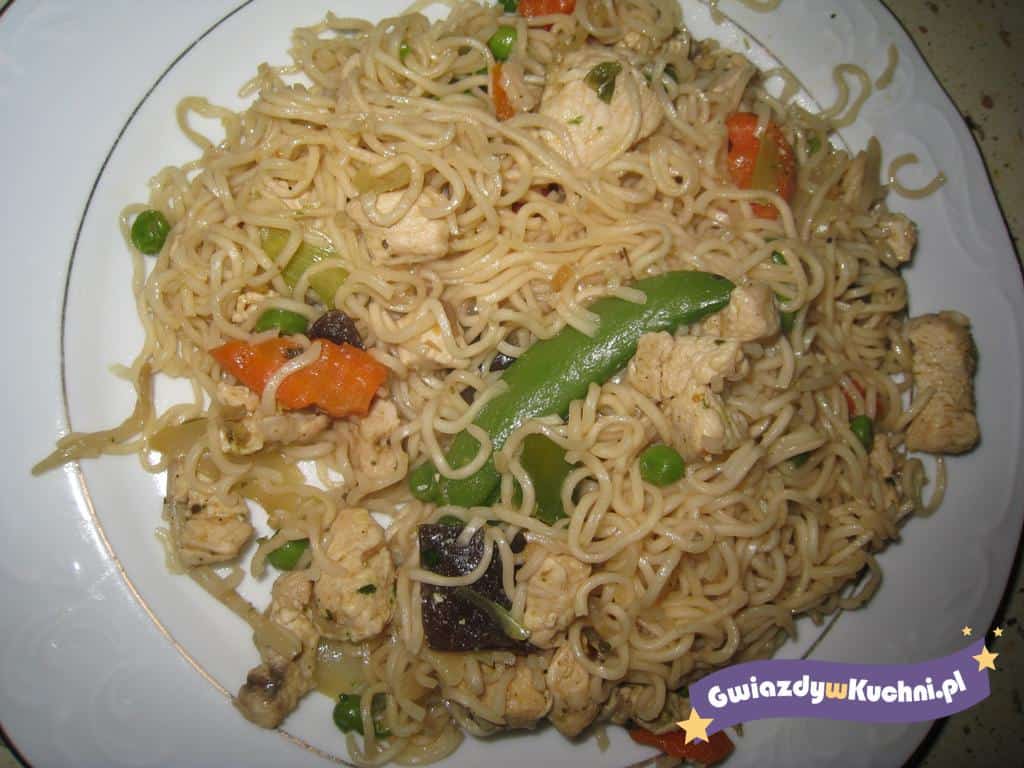 Makaron zalewamy wrzątkiem, przykrywamy na chwilę aż napęcznieje i nie będzie twardy. Pierś z kurczaka kroimy i podsmażamy na oliwie, najlepiej na dużej patelni ( lub w woku). Dorzucamy warzywa mrożone z torebki ( papryka, fasolka szparagowa, groszek, marchewka, grzyby mun )i dusimy. Doprawiamy mocno do smaku imbirem, pieprzem i solą, sokiem z cytryny i sosem sojowym. Mieszamy z odsączonym makaronem i chwile smażymy. Podajemy gorące