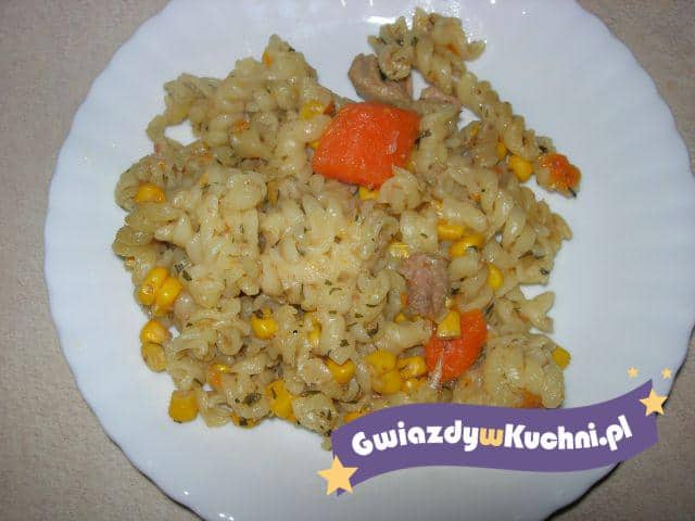Makaron gotujemy w osolonej wodzie wg przepisu, marchew obieramy, kroimy w drobną kostkę, wrzucamy na rozgrzaną patelnię z oliwą, podsmażamy, dodajemy odrobinę wody, gdy marchew zmięknie dodajemy kukurydzę i ugotowany makaron, przeciśnięty czosnek, oregano, sól, dusimy 3 – 5 minut, podajemy.