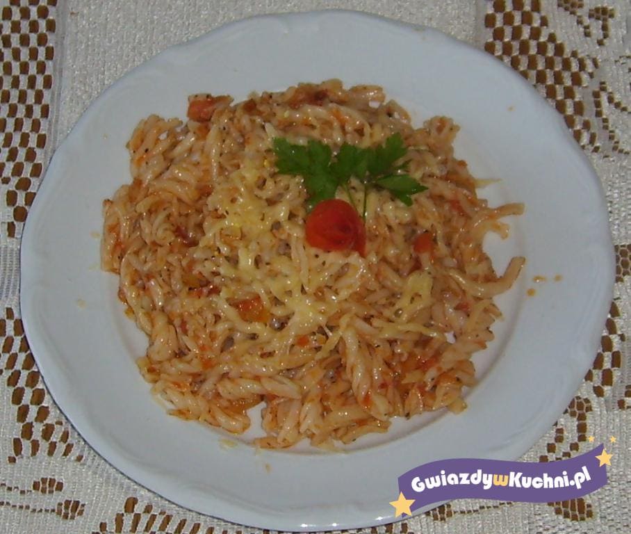 Makaron ugotować w osolonej wodzie. Na patelni rozgrzać masło. Przesmażyć drobno pokrojoną cebulę. Dodać pokrojone pomidory i razem przesmażyć. Dodać ketchup i doprawić do smaku. Dodać makaron. Wymieszać i chwilę podgrzać. Można posypać startym żółtym serem.