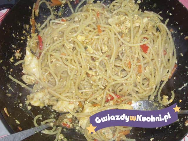 Makaron ugotować al’dente w lekko osolonej wodzie. Piersi z kurczaka pokroić na wąskie paski, posypać przyprawą do kurczaka. Usmażyć na oleju. Dodać startą na tarce o dużych oczkach marchewkę, cebulkę pokrojoną w kostkę, posiekaną pietruszkę, sos sojowy i pieprz. Dusić przez około 15 minut, wymieszać z makaronem.