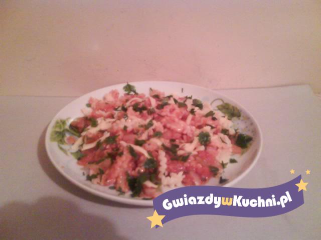 Makaron ugotować w osolonej wodzie i odcedzić. Cebulę obrać, pokroić w kostkę, podsmażyć na gorącym oleju, dodać posiekany czosnek, keczup, wymieszać i jeszcze chwilę podsmażyć. Makaron wymieszać z przygotowanym sosem i posypać posiekana natką pietruszki.