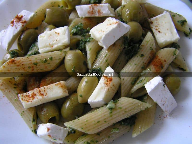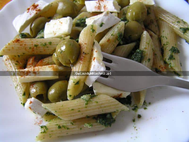 Ugotować makaron. Ser pleśniowy pociąć w paski. Szpinak wraz z czosnkiem przepuszczonym przez praskę podsmażyć na oleju, wymieszać z makaronem, oliwkami, serem pleśniowym, posypać solą i papryką czerwoną.
