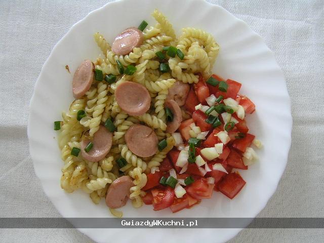 Ugotować makaron, odcedzić, przysmażyć na patelni wraz z serem. Parówki pociąć w plastry. Szczypiorek opłukać, osączyć, posiekać. Cebulę pociąć w kostkę, pomidor w cząstki. Wymieszać makaron z parówkami, posypać szczypiorkiem, doprawić solą do smaku. Podawać z pomidorami i cebulą.