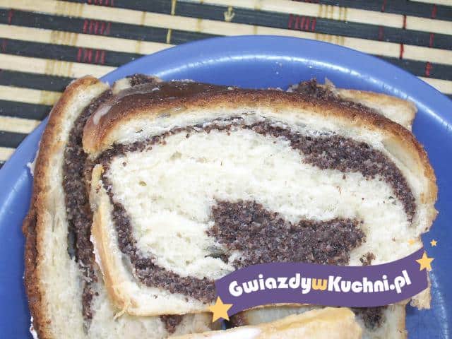 2/3 mleka należy podgrzać i rozpuścić w nim drożdże. W misce połączyć mąkę, połowę cukru, skórkę z cytryny i jedno jajko. Na koniec dodać drożdże rozprowadzone w mleku i zagnieść ciasto. Odstawić na 30 minut w ciepłe miejsce do wyrośnięcia. Pozostałe mleko zagotować, zdjąć z ognia, dodać masę makową, jajko, posiekane orzeszki pistacjowe, pozostały cukier i cukier waniliowy. Wymieszać i schłodzić, po schłodzeniu dodać jeszcze jedno jajko. I ponownie wymieszać. Ciasto drożdżowe rozwałkować, wyłożyć na nie masę makową i zawinąć. Ciasto przełożyć na wysmarowaną tłuszczem i wysypaną mąką blaszkę, odstawić w ciepłe miejsce na 30 minut, następnie piec przez 50 minut w temp. 180 stopni.