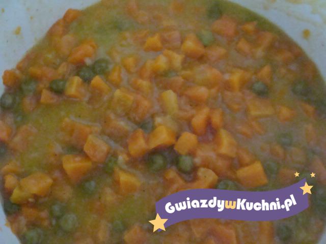 Zielony groszek należy umyć i odcedzić. Marchewkę należy obrać, umyć i pokroić w kostkę. Warzyw należy ugotować do miękkości w lekko osolonej wodzie z cukrem. Po ugotowaniu odcedzić. Szklankę bulionu z gotowania należy zostawić. Z 1 łyżki masła oraz mąki należy przygotować zasmażkę i rozprowadzić ją wywarem. Całość gotować 5 minut. Warzywa należy włożyć do garnka, dodać zasmażkę i gotować około 5 minut dodając resztę masła i doprawiając do smaku.