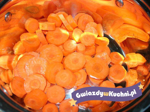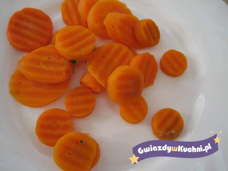 Oskrobane marchewki wypłukać, cienko poszatkować, włożyć do rondla z rozgrzanym masłem, podlać niewielką ilością wody ( ćwierć szklanki ) i dusić pod przykryciem na małym ogniu do miękkości uważając, aby marchewka się nie przypaliła. Pod koniec duszenia dodać roztarty czosnek, cukier i estragon. Tuż przed podaniem podprawić śmietankę wymieszaną z mąką.