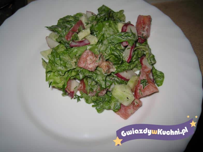 Liście sałaty porwać na kawałki i włożyć do misy. Na sałatę ułożyć pokrojone pomidory i ogórek i posypać szczypiorkiem i ziołami. Polać sosem.
