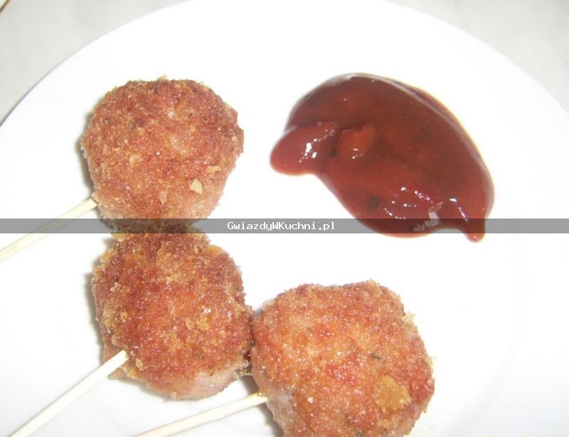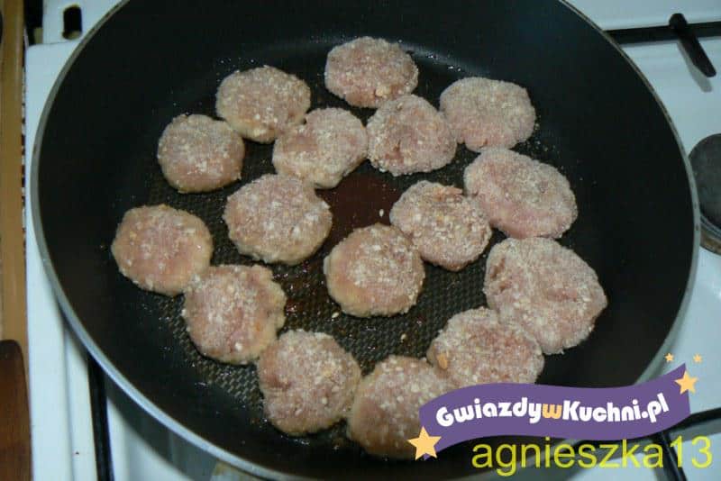 Do mięsa dodać przyprawy (sól i pieprz do smaku), posiekaną pietruszkę i szczypiorek, jajko, wodą,dobrze wyrobić. Przykryć i wstawić do lodówki na 30 minut. Z oziębionego mięsa formować małe kotleciki, obtaczać w bułce i kłaść na rozgrzany olej. Smażyć ze wszystkich stron.