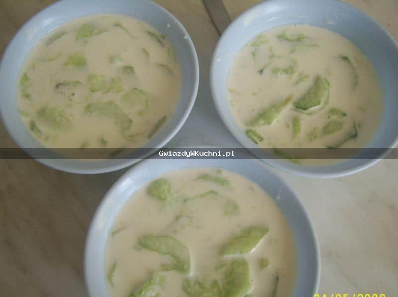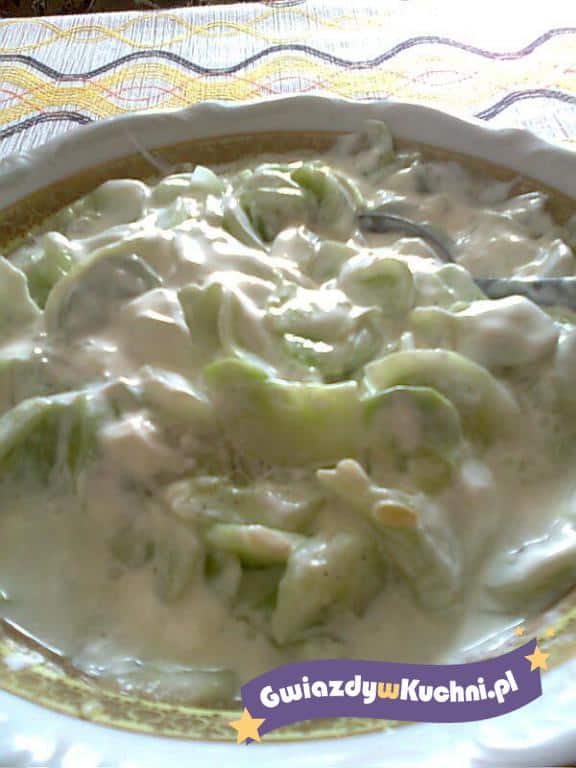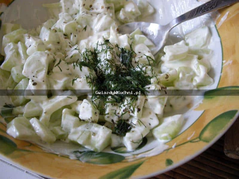 Umyte ogórki obrać, pokrajać cienko na plasterki, wymieszać z koperkiem i śmietaną, doprawić do smaku solą, pieprzem, cukrem, octem.