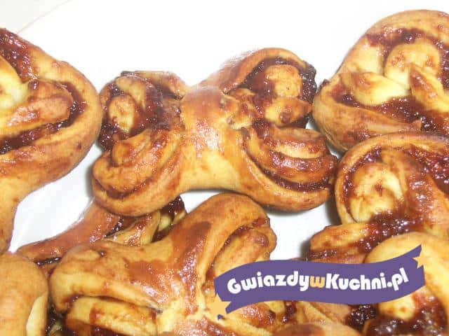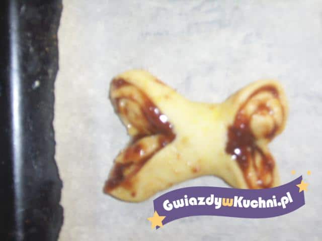Mleko rozprowadzić z drożdżami i cukrem. Dodać mąkę, jajka, masło i sól. Wyrobić gładkie ciasto. Pozostawić w ciepłym miejscu, do podwojenia objętości. Po tym czasie ciasto podzielić na mniejsze kawałki i uformować z nich kulki. Każdą kulkę rozwałkować, posmarować 1 łyżką dżem i zwinąć jak naleśnika. Następnie obydwa końce podłożyć pod spód, naciąć ( tylko trochę). Ciasto wywinąć na boki by powstał kształt motylka. Uformowane położyć na blaszce i pozostawić na 10 minut do wyrośnięcia. Przed pieczeniem posmarować motylki jajkiem roztrzepanym z 2 łyżeczkami mleka. Piec w temperaturze 180* około 20-25 minut