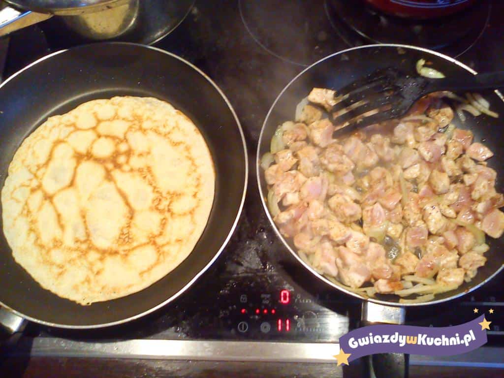 Zmiksować wszystkie składniki na ciasto, usmażyć cienkie naleśniki.