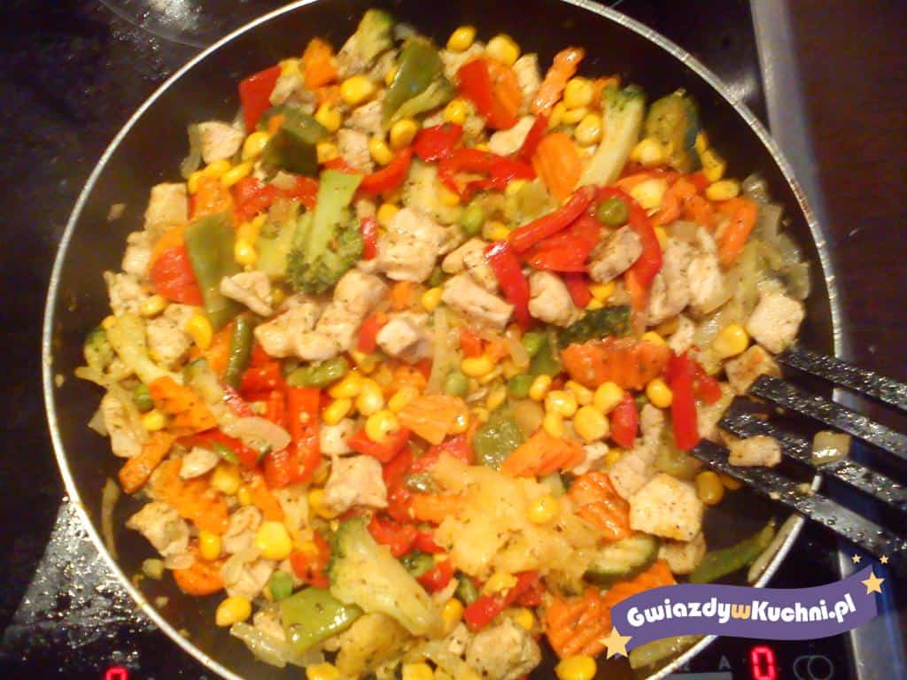 Wyłożyć na talerzyk jeśli nie posiadamy drugiej patelni potrzebnej do smażenia mięska. Pierś pokroić na kawałki obtoczyć w przyprawie i podsmażyć na złoty kolor, do mięska dodać wcześniej uduszone warzywka i dusić jeszcze chwilę. Doprawić do smaku.