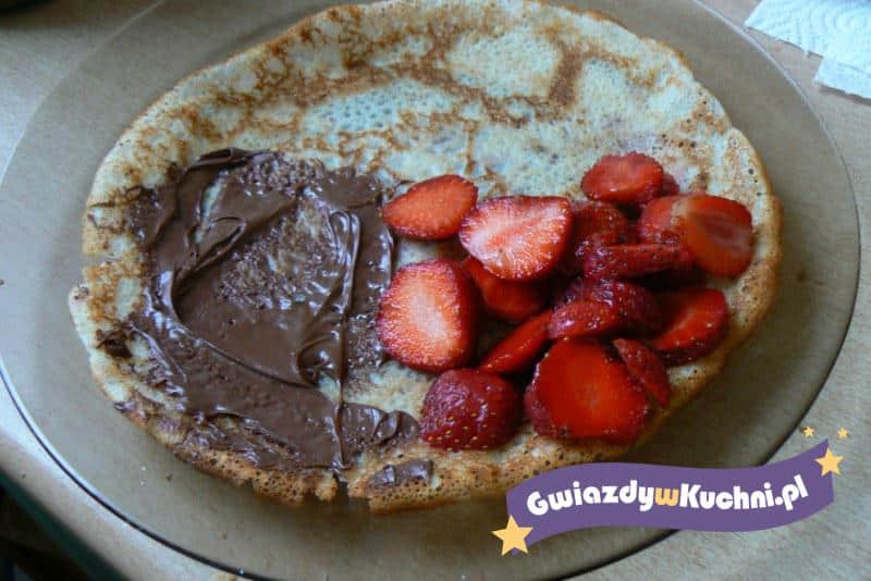 Upiec naleśniki. Na gorące nałożyć po łyżeczce nutelli i umyte, obrane i pokrojone w plasterki truskawki. Złożyć na 4.