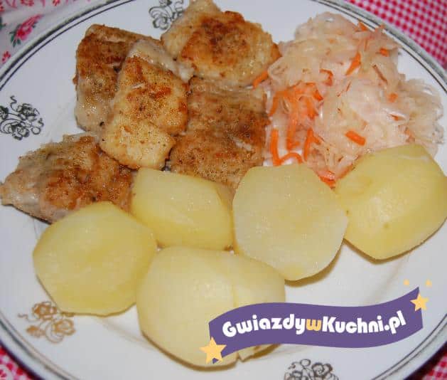 Rybę smażymy na oleju. Należy ją najpierw rozmrozić, przyprawić solą, pieprzem i obtoczyć w mące. Ziemniaki gotujemy około 20 min. Z łyżeczką soli. Kiszoną kapustę łączymy ze starta marchewką doprawioną solą pieprzem i oliwą. Wszystkie składniki umieszczamy na talerzu.