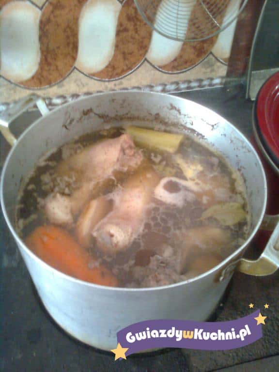 i zalać ok 3 l zimnej wody. Zagotować i zmniejszyć ogień do minimum. Dodać obrane i umyte warzywa. Gotować