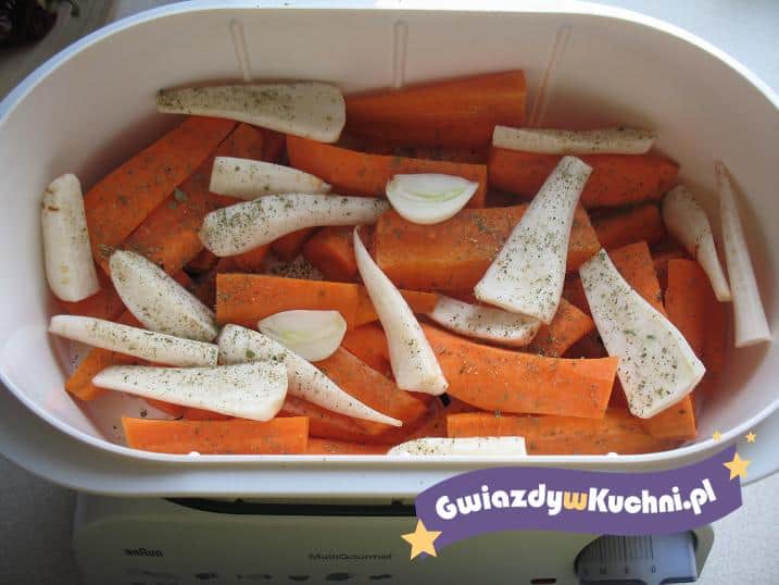 Warzywa obrać, umyć, pokroić na mniejsze kawałki, ułożyć w parowarze, posypać ziołami. Parować 25 min. Świetnie smakuje np. Z sosem tuńczykowym lub topionym masłem jako dodatek do obiadu.