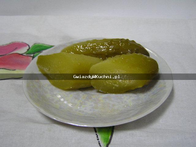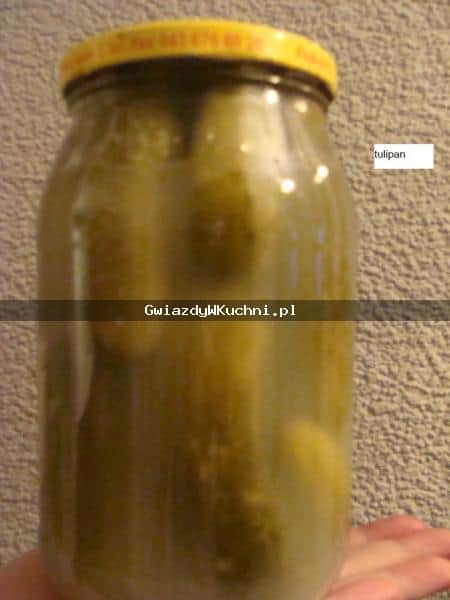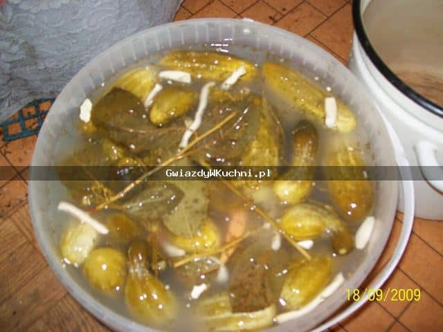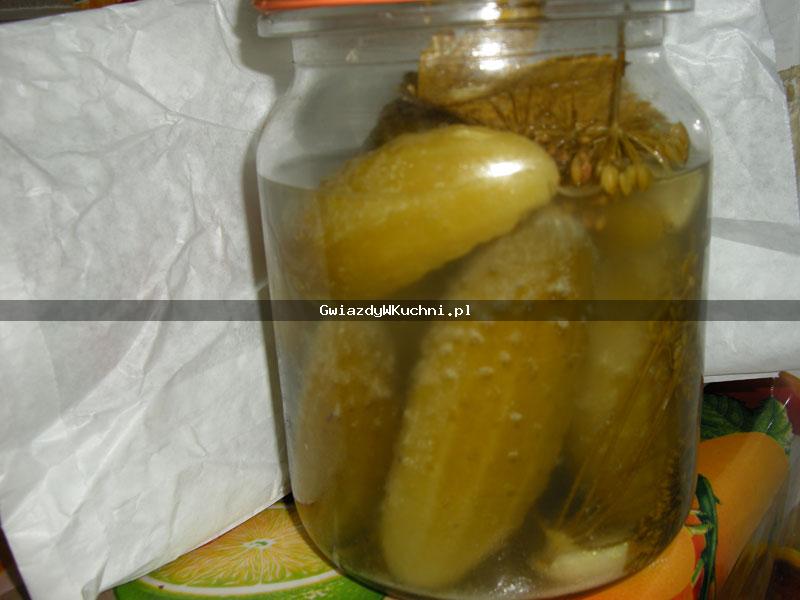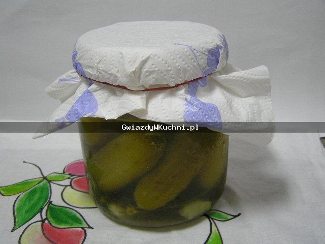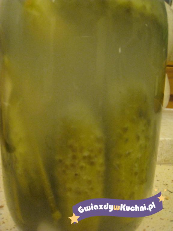 Dokładnie umyć ogórki. Układać je pionowo w dobrze wyparzonym wcześniej słoiku. Na dnie umieścić przekrojone ząbki czosnku, koper, kawałki chrzanu i liście czarnej porzeczki. Zalać gorącą wodą wymieszaną z solą. Mocno zakręcić i odwrócić słoik do góry dnem. Pasteryzować przez około 20 minut w piekarnik w temperaturze 90 stopni.
