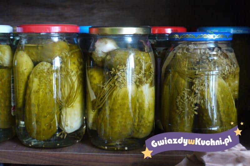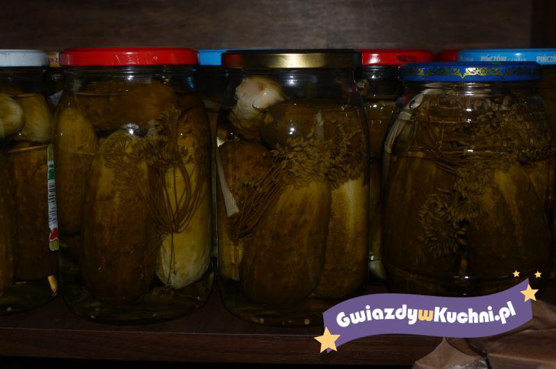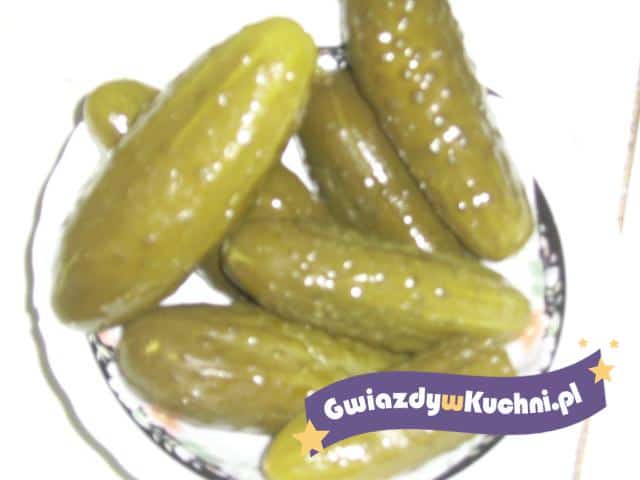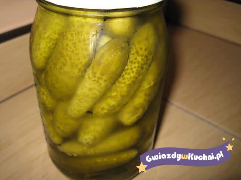 Ogórki umyć, osaczyć, ułożyć ciasno w wygotowanych i osuszonych lub wyprażonych w piekarniku słojach weka, przekładając przyprawami. Zagotować ok. 1/2 szklanki octu z ok. 2 1/3 szklanki wody, solą i cukrem. Gorącym płynem zalać ogórki. Ogórki i zalewa powinny sięgać do 3 cm poniżej brzegów słoi. Pasteryzować. Czas pasteryzacji powinien wynosić 35 min. Od chwili zagotowania się wody w naczyniu, do którego słoje zostały wstawione.