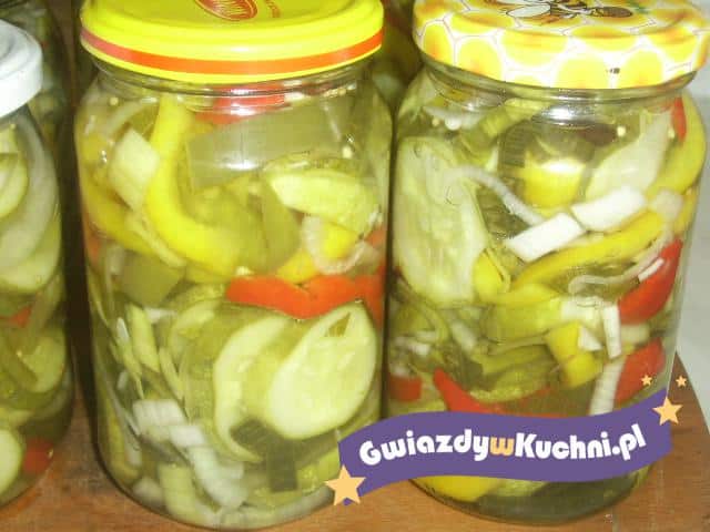 Wszystkie ogórki pokroić w plasterki. Porę przeciąć na pół i drobno pokroić. Paprykę i cebulę pokroić w drobne paseczki. Warzywa wymieszać i zalać słoną zalewą (9 szklanek wody i 3/4 szklanki soli) na 3 godziny. Po upływie czasu odlać wodę i warzywa przełożyć do słoików i zalać zalewą. Zalewę zagotować; 6 szklanek wody, 4 szklanki cukru, 2 szklanki octu, ziele angielskie, gorczyca. Słoiki zakręcamy i pasteryzujemy 3-4 minuty.