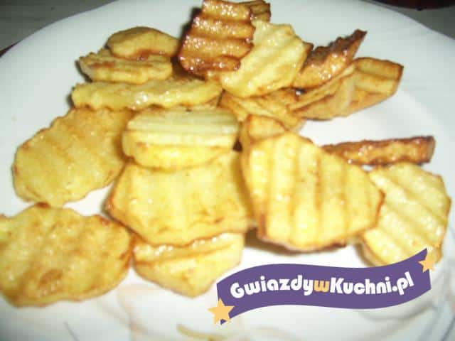 Ziemniaki obieramy, myjemy i kroimy na plasterki. Plasterki osuszamy na ręczniku papierowym i smażymy w głębokim oleju. Po usmażeniu posypujemy solą.