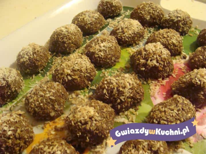 Mleko, szklankę mleka w proszku, cukier puder oraz masło łączymy ze sobą i zagotowujemy. Następnie dodajemy pozostałą szklankę mleka w proszku oraz kakao, dokładnie wszystko razem mieszamy. Następnie z masy formujemy kulki wielkości średniego kartofelka i obtaczamy obficie w wiórkach kokosowych.