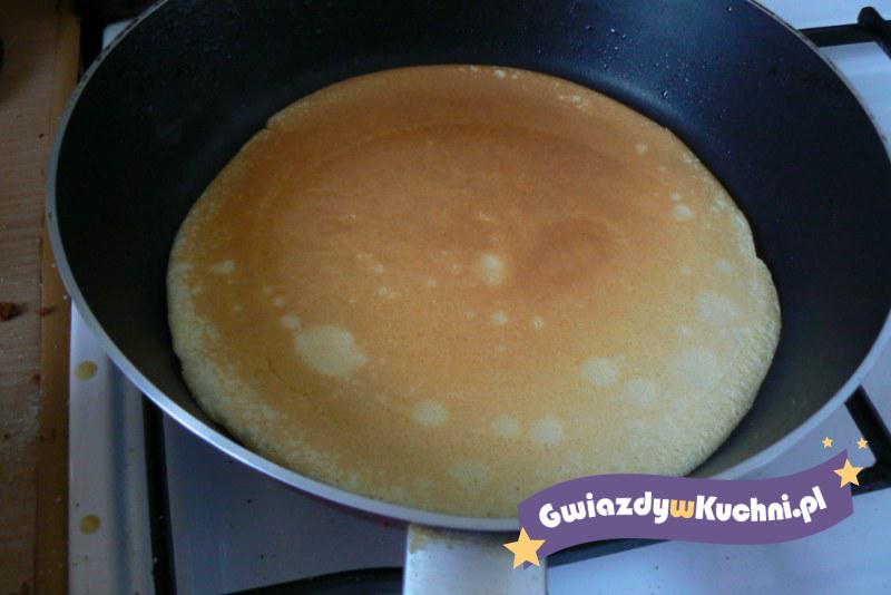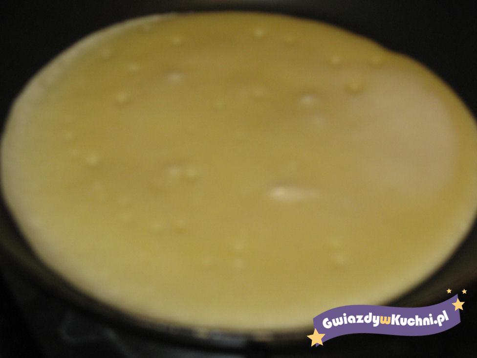 Żółtka oddzielić od białek i utrzeć je z cukrem Dodać śmietanę. Z białek ubić pianę i dodać do żółtek, wsypać mąkę i wszystko dobrze wymieszać. Masło rozgrzać na patelni, na nią wylać całą masę i smażyć pod przykryciem na małym ogniu. Po kilku minutach omlet podważyć, aby spłynęła reszta masy i dołożyć pod spód masła. Podsmażony omlet włożyć na 5 min do gorącego piekarnika. Zarumieniony wyjąć, na środek położyć konfiturę i złożyć na pół. Posypać cukrem pudrem.