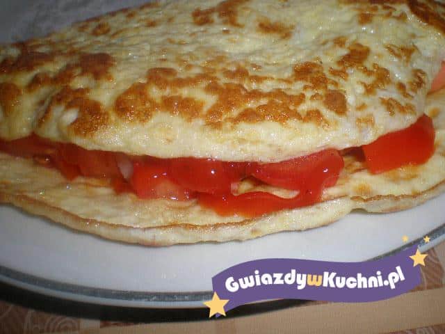 Pomidory pokroić w kostkę. Cebulę obrać i drobniutko posiekać. Jajka rozkłócić trzepaczką lub widelcem dodając do nich śmietanę i doprawiając je do smaku solą oraz pieprzem. Na suchej patelni rozgrzać masełko. Gdy będzie dobrze rozgrzane usmażyć na nim omlet podważając go po bokach tak, żeby jajka dobrze się ścięły, w międzyczasie posypać go startym serem żółtym. Ser powinien się roztopić. Omlet przełożyć na talerz, ułożyć na nim pomidory, posypać je cebulką. Omlet złożyć na pół. Podawać na gorąco.
