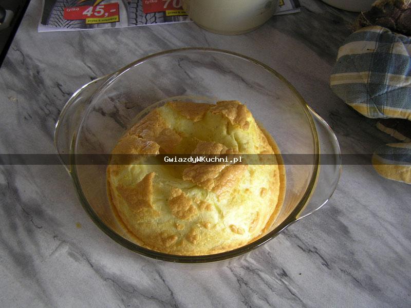 Przełożyć do żaroodpornego naczynia, wierzch posypać pozostałym serem i wstawić do nagrzanego piekarnika.