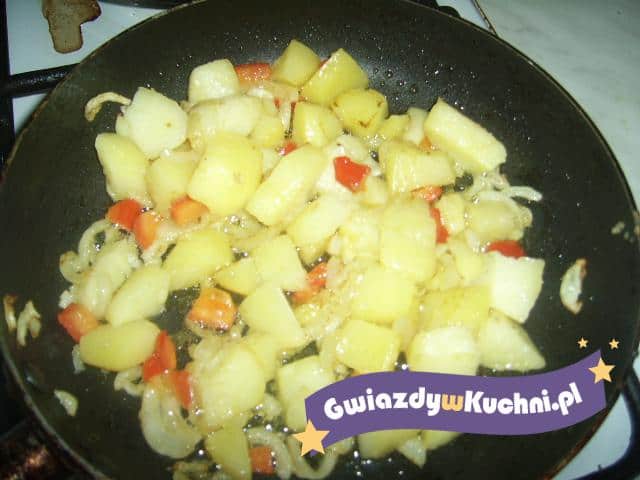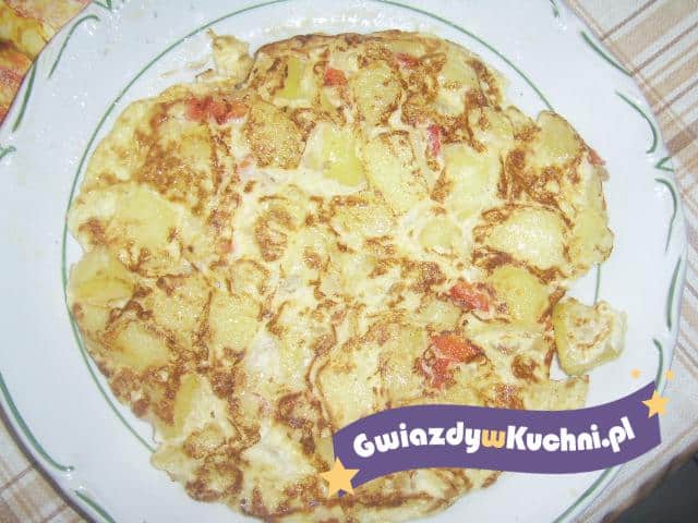 Ziemniaki kroimy na plasterki. Cebulę i paprykę kroimy na drobna kostkę i podsmażamy razem z ziemniakami. Jajka ubić i wymieszać z mąkę, mlekiem i posolić. Jajka wylewamy na podsmażone warzywa. Smażyć na małym ogniu, aż spód się zrumieni i przewracamy na drugą stronę.