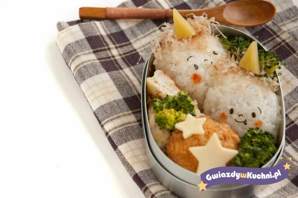 Ryż ugotować na sypko i gdy nieco przestygnie uformować go w nieduże kulki. Mięso zmielić w maszynce, dodać soli, pieprzu i przypraw. Uformować małe kotleciki, obtoczyć je w mące i jajku, a następnie usmażyć na patelni. Ugotować marchewkę i gdy ostygnie wyciąć z niej kształty, resztę dodać do pudełka. Ugotowanego brokuła podzielić na różyczki. Z plasterka sera wyciąć kształt słońca.