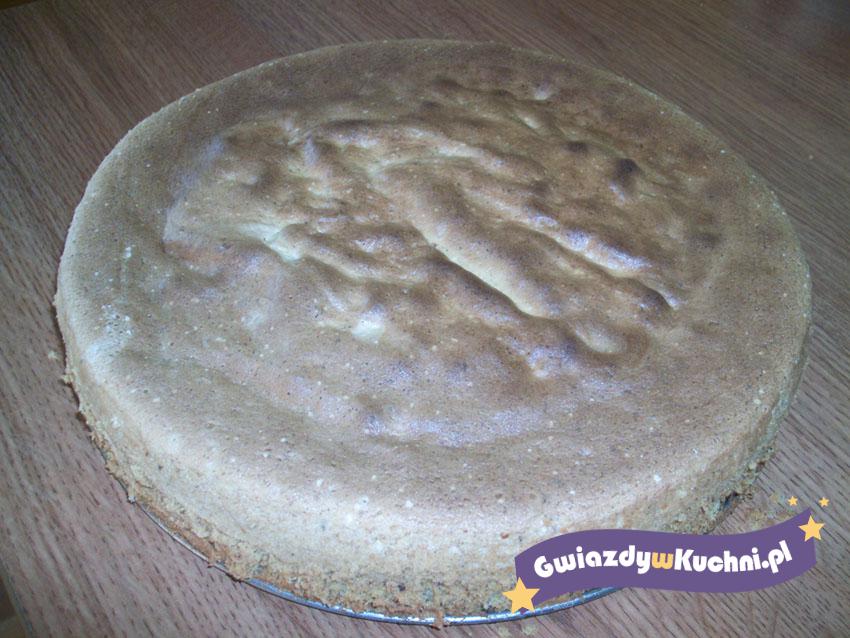 Białka oddzielić od żółtek. Białka ubić ze szczyptą soli na sztywną pianę. W czasie ubijania dodać cukier. Do piany dodawać po jednym żótku. Mąkę zmieszać z orzechami i proszkiem do pieczenia. Połączyć z masą jajeczną. Biszkopt przelać do tortownicy i piec ok 35 minut w 180 stopniach