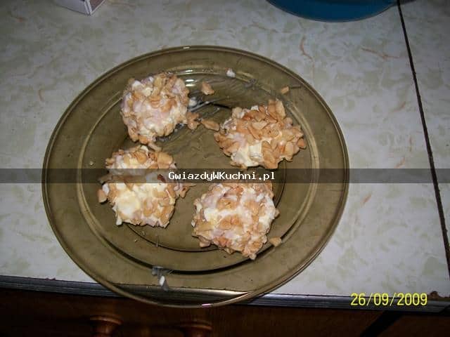 Jajka gotujemy na twardo, studzimy i obieramy. Następnie bardzo drobniutko siekamy. Cebulę obieramy i trzemy na tarce. Szynkę bardzo drobno siekamy. Do masy dodajemy majonez, sól oraz pieprz. Wszystko dokładnie ze sobą mieszamy. Z masy formujemy kulki wielkości orzecha włoskiego. Orzeszki bardzo drobniutko siekamy. Następnie kulki obtaczamy w orzeszkach i wstawiamy na kilka godzin do lodówki. Następnie przekładamy na półmisek i dekorujemy wg upodobań.