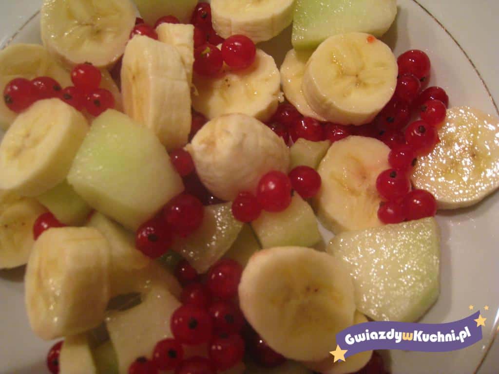 Porzeczki dokładnie umyć, oczyścić i oderwać ogonki. Melona obrać ze skórki pokroić na małe kawałeczki. Banany obrać ze skórki i pokroić w grubsze plastry. Wszystkie owoce połączyć dokładnie ze sobą i na koniec polać miodem płynnym wymieszanym z syropem klonowym i z wanilią. Wstawić do lodówki na co najmniej 30 minut.
