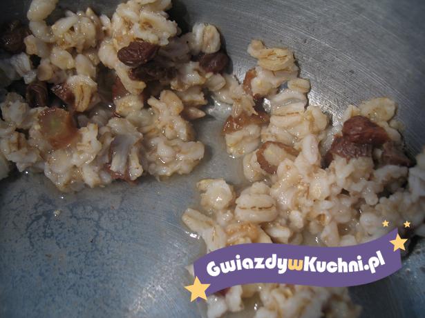 Płatki, cukier i rodzynki zmieszać, zalać woda i odstawić na noc. Rano można zalać mlekiem lub zjeść na wodzie podgrzane.
