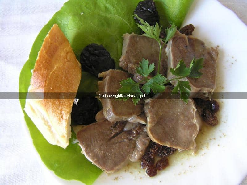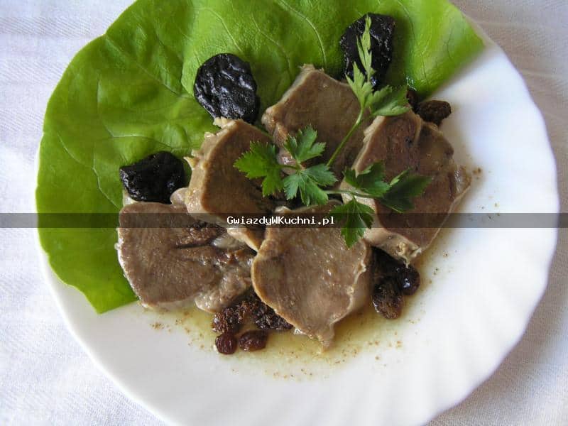 W winie moczymy rodzynki i pokrojone paseczki śliwki. Umyte ozorki z wyciętymi śliniakami kładziemy do zimnej, czystej wody, zagotowujemy i trzymamy na ogniu przez 20 minut. Ugotowane wyjmujemy łyżką cedzakową i przekładamy do naczynia z zimną wodą, po 2 minutach przekładamy na deskę i zdejmujemy z ozorków szorstką skórę. Zagotowujemy 2 litry wody z włoszczyzną i przyprawami, przekładamy obrane ozorki, gotujemy do miękkości na średnim ogniu.