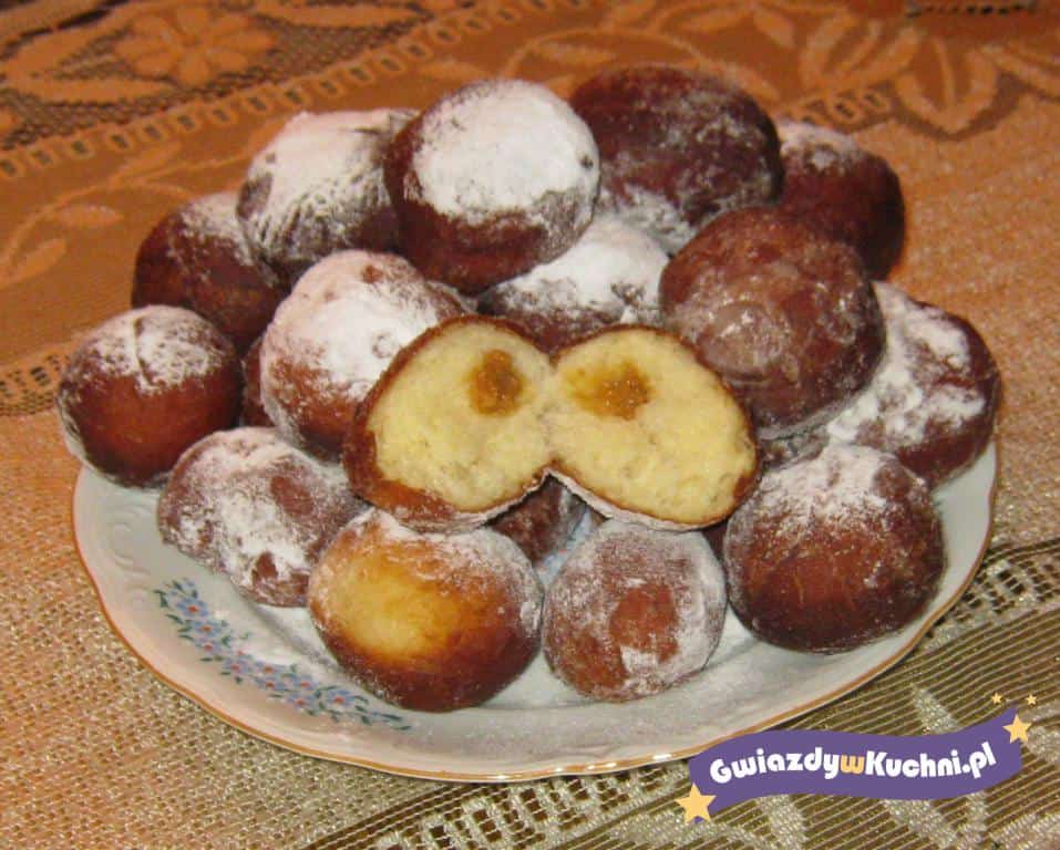 W 3/4 szklanki mleka z dodatkiem łyżki cukru i kopiastej łyżki maki rozmieszać drożdże. Odstawić w ciepłe miejsce do czasu aż zaczną się unosić do góry. Jajka ubić z pozostałym cukrem na puszystą masę. Do mąki dodać przygotowane drożdże, jajka, alkohol i ok. 3 łyżki oleju. Dodać ok. Łyżeczkę soli. Zarobić ciasto i odstawić w ciepłe miejsce, gdy zacznie powiększać swą objętość, wyłożyć na stolnicę oprószoną mąką i rozpłaszczyć ciasto dłońmi, albo rozwałkować na grubość ok. 1 centymetra. Wykrawać literatką krążki, nakładać łyżeczką masę kajmakową i zawijać małe pączki. Smażyć na rozgrzanym oleju ok. 7 minut, obracając kilkakrotnie. Przestudzone pączki można posypać cukrem pudrem.