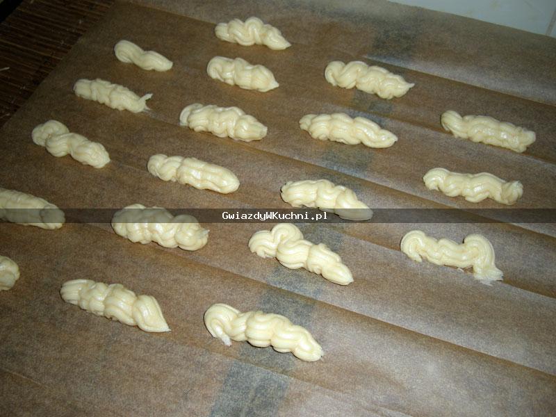 Margarynę, wodę i sól gotujemy. Wsypujemy przesianą mąkę i nie zdejmując z ognia energicznie mieszając, po 10 minutach zdejmujemy z ognia i przestudzamy. Następnie stopniowo dodajemy roztrzepane jaja, ciągle miksując do momentu, aż ciasto uzyska konsystencję gęstej śmietany. Pod koniec dodajemy kminek, wkładamy do płóciennego worka zakończonego zdobnikiem, wyciskamy podłużne paluszki na lekko posmarowane tłuszczem blachy. Wstawiamy do nagrzanego piekarnika i pieczemy w 200 stopniach przez kwadrans przy lekko uchylonych drzwiczkach piekarnika na kolor jasnozłoty.